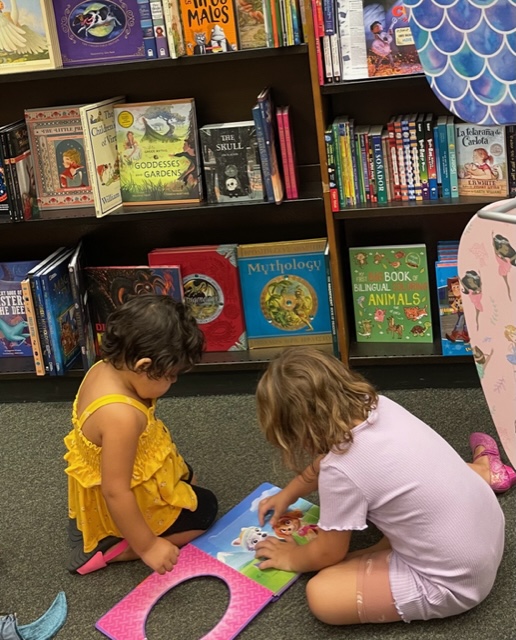 Allí, sentadas en el suelo, con su madre, hojean todos los libros que llaman su atención y los bajaron.