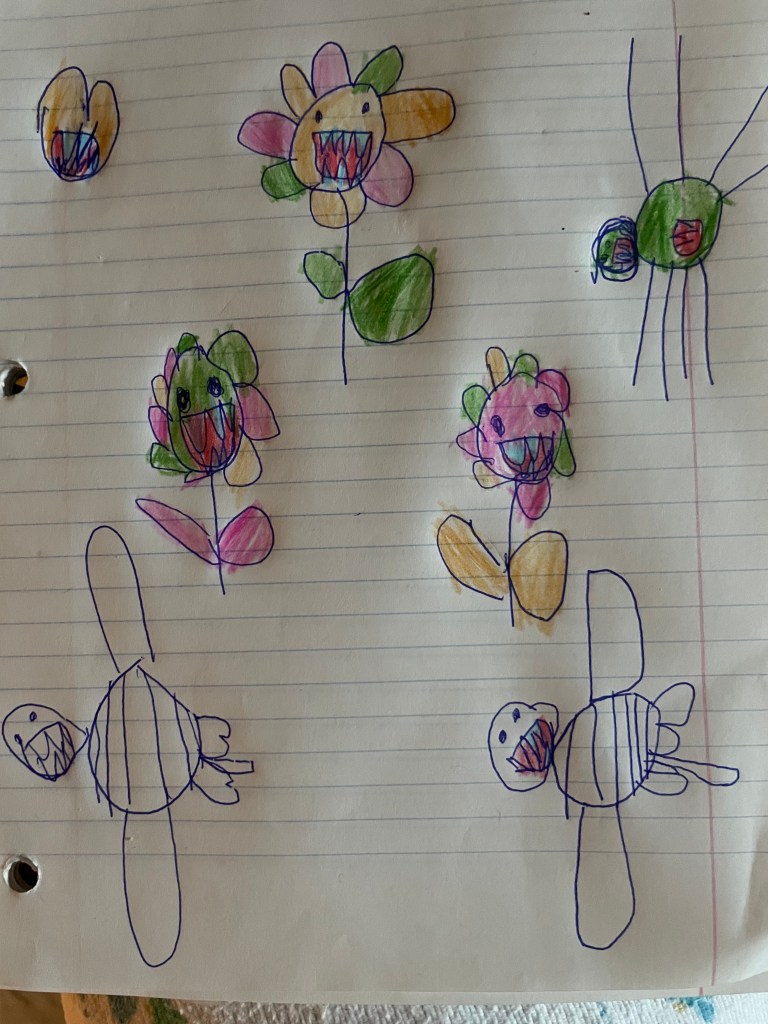 Mira esta flor y esta otra flor con ojos y dientes de fantama. Y la abeja y la araña. Este es el mosco. No me gusta mucho, por eso no le pinté.