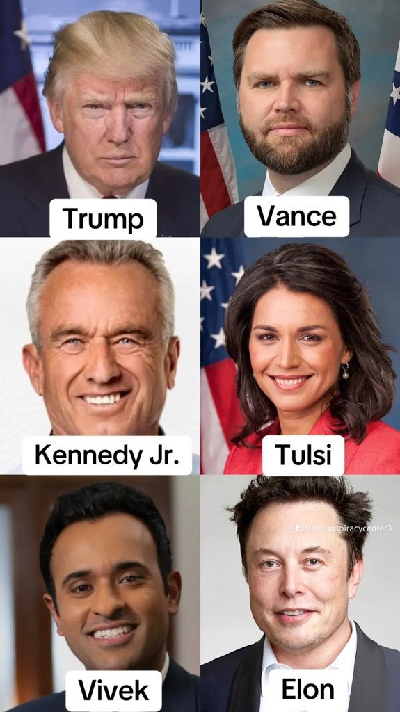 Alli están, a más del presidente, su vicepresidente, J D Vance, Robert Kennedy Jr. Demócrata ex candidato presidencial; Tulsi Gabbard, ex miembro de la Cámara de Representantes por el partido Demócrata; Viveck Ramaswami, empresario de Biotecnología, quien apareció como aspirante a la presidencia por el partido Republicano frente a Trump pero que terminó dándole su total respaldo y, Elon Musk, el gran genio del emprendimiento, creador de Tesla, Space, Space X, Red Social X y mucho más, quien impulsó definitivamente la candidatura de Trump
