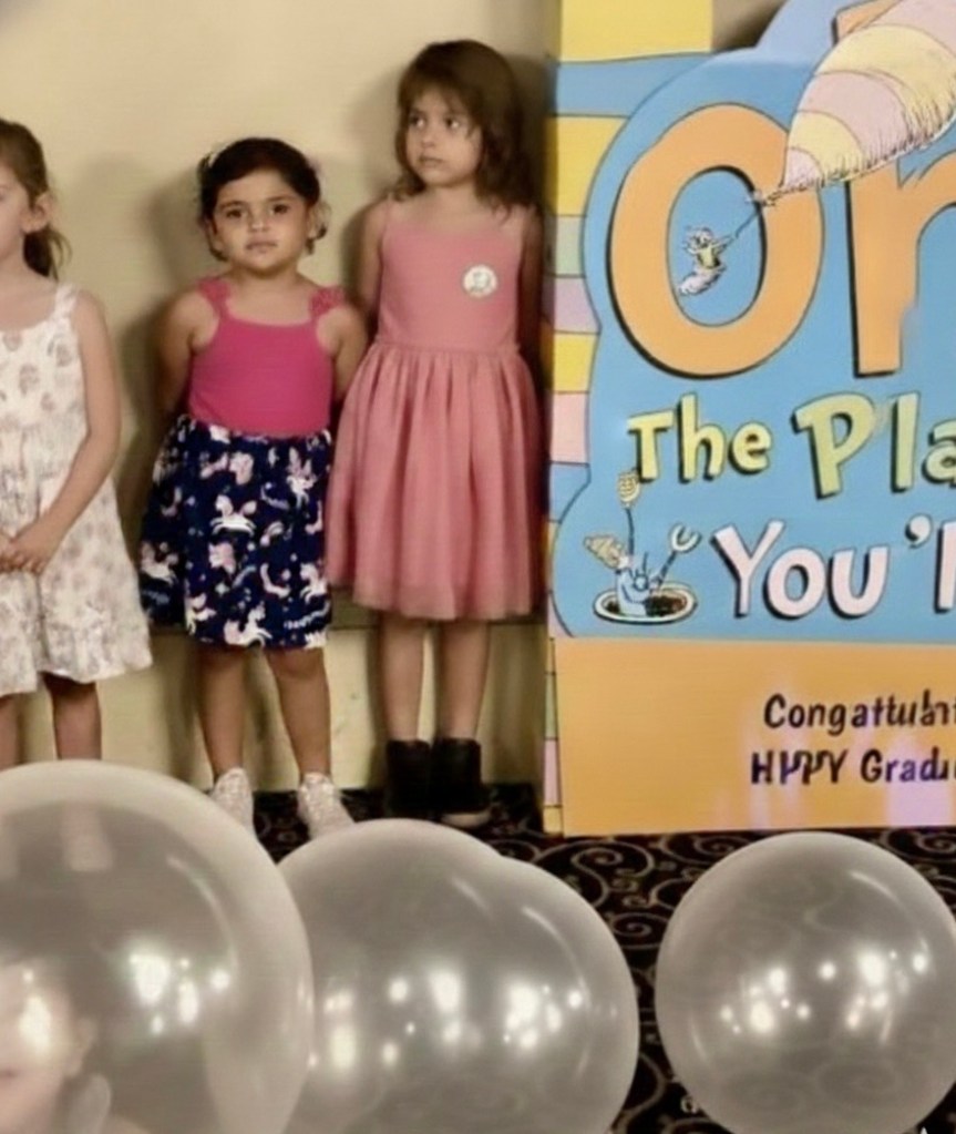 Mientras los pequeños se divertían, los organizadores proyectaron fotos de los graduados en la pantalla del espacioso salón. Las lámparas gigantes, los globos de colores y las fotos de los niños adornaban el lugar. Era muy tierno verlos, recordando su transición desde los cuatro hasta los seis años.