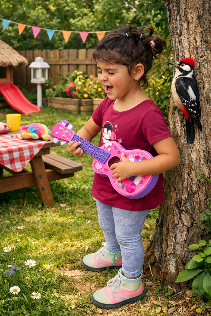 Y, ¡oh, sorpresa!, fue tan linda su función que de pronto oímos el típico toc-toc-toc. ¡Ahí estaba! El famoso pájaro carpintero con sus dos hijitos pequeños, picoteando en el árbol de la casa. La tarde soleada y los patitos jugueteando en el lago fueron el complemento perfecto para mi pequeña artista.